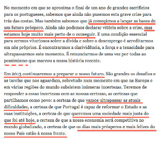 A eles, e a todos vós, no fim deste ano tão difícil em que tanto já nos foi pedido, peço apenas que procurem a força para, quando olharem os vossos filhos e netos, o façam não com pesar mas com o orgulho de quem sabe que os sacrifícios que fazemos hoje, as difíceis decisões que estamos a tomar, fazemo-lo para que os nossos filhos tenham no futuro um Natal melhor." (Pedro Passos Coelho, actual Primeiro-ministro, 26 de Dezembro de 2012)